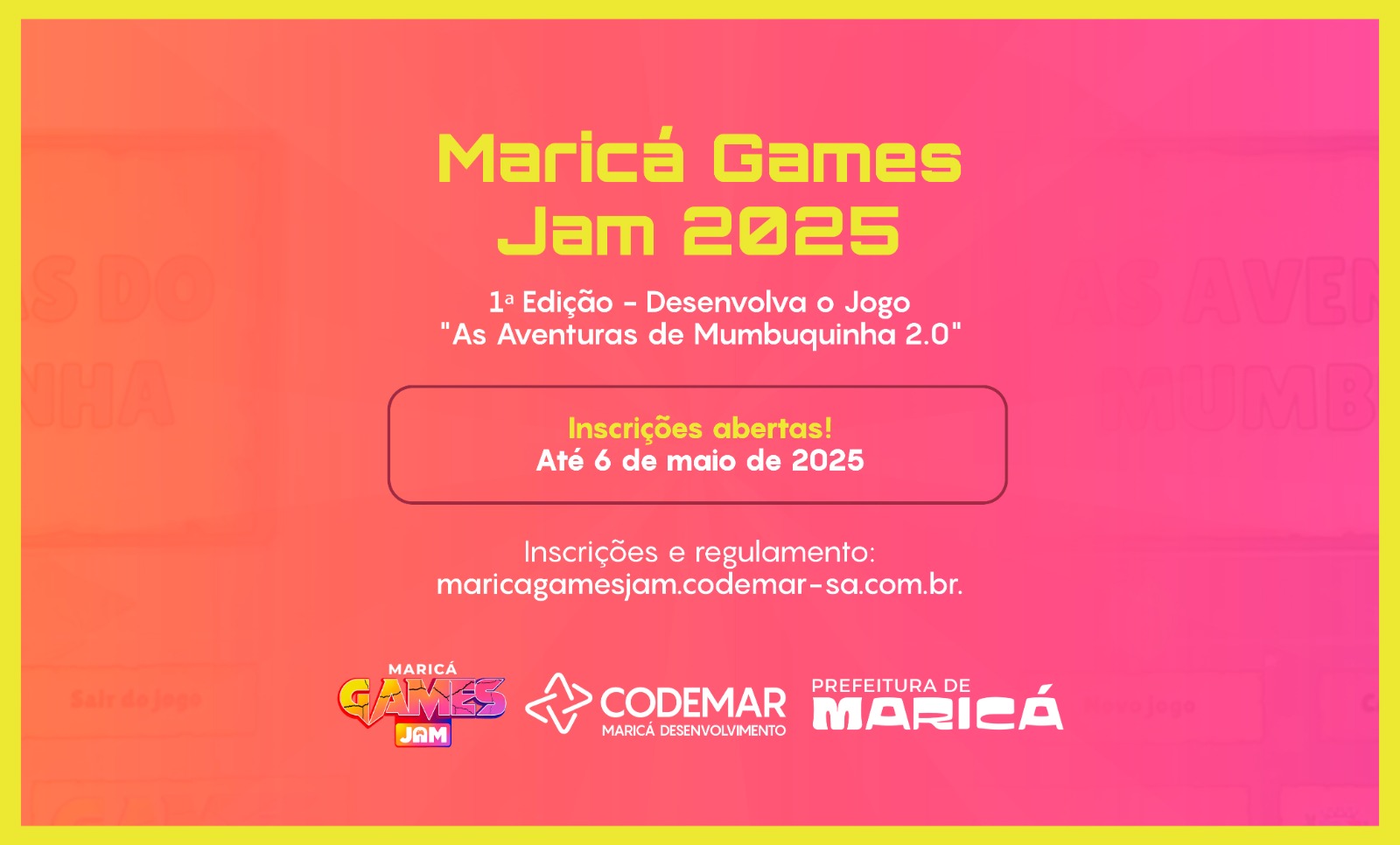 As inscrições seguem até o dia 06 de maio, no site oficial: maricagamesjam.codemar-sa.com.br 🕹️.