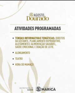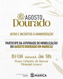 A Prefeitura de Maricá, por meio da Secretaria de Saúde, realiza neste sábado (19/08), a partir das 9h, uma ação do Agosto Dourado na Praça Orlando de Barros Pimentel, no Centro, representando o mês de apoio e incentivo à amamentação na cidade. A mobilização é aberta ao público e contará com tendas informativas, onde serão proporcionados diálogos sobre direitos da gestante, planejamento reprodutivo, aleitamento e alimentação saudável, saúde emocional e doação de leite. As participantes também poderão assistir a uma peça teatral, além de participar de alongamento e de um momento dedicado à amamentação.