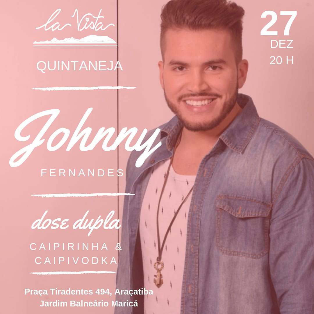 Sim! É isso mesmo! Antes do reveillon, boa música na Quintaneja do La Vista! O ritmo sertanejo vai tomar conta do La Vista com Johnny Fernandes, a partir das 20:00 h. Cantor e compositor, o artista interpreta sucessos de Marília Mendonça, Jorge e Mateus, Wesley Safadão e Luan Santana, em suma, o melhor do sertanejo.