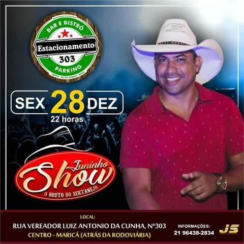 Nesta sexta-feira, antes do reveillon, você tem um encontro marcado com a galera forrozeira de Maricá. E, dessa vez, será o Juninho Show, o bruto do sertanejo, no Bar & Bistrô Estacionamento 303, no centro de Maricá. O endereço é Rua Vereador Luiz Antônio da Cunha, 303 – Centro (atrás da Rodoviária Jacintho Luiz Caetano). Informações: 96438-2834.