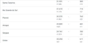 • 1.578.376 casos confirmados; eram 1.543.341 infectados até a noite de sexta, ou seja, houve um aumento de 35.035 infectados.