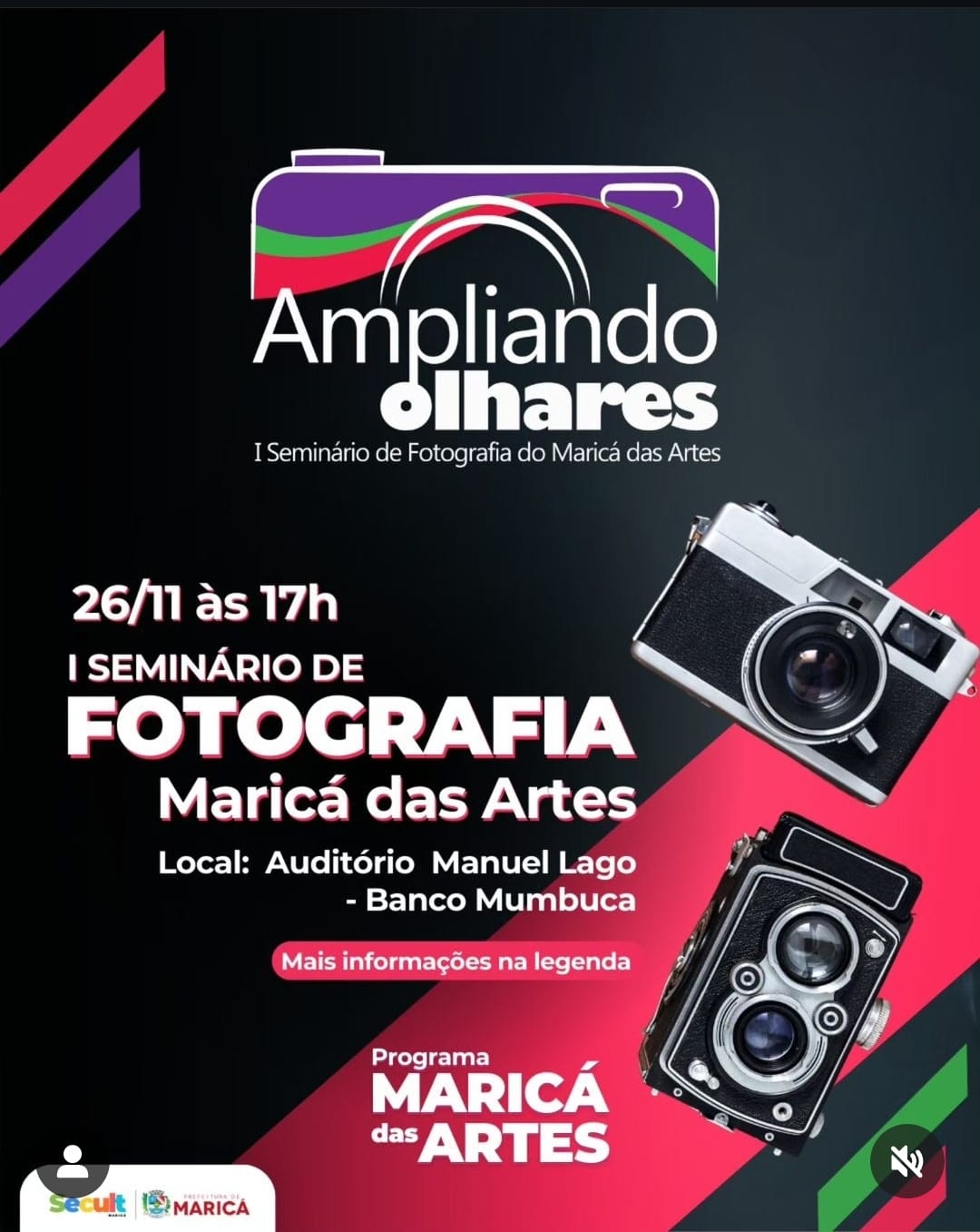 A Prefeitura de Maricá, por meio da Secretaria de Cultura, realiza no dia 26 de novembro, às 17h, o 1° Seminário de Fotografia Maricá das Artes, no auditório do Banco Mumbuca, no Centro. O evento tem como objetivo apresentar o talento local e expandir a percepção visual e artística dos alunos do projeto “Maricá das Artes”.