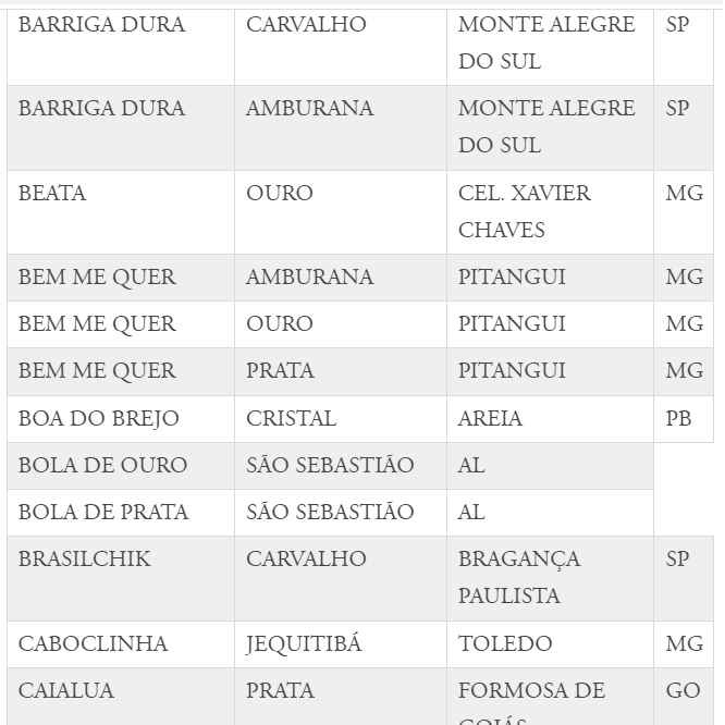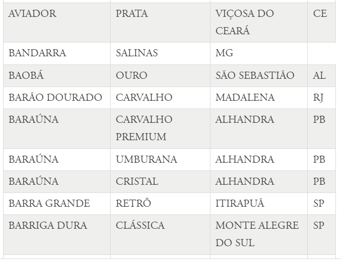 - Boa do Brejo (Tipo Cristal), de Areia;