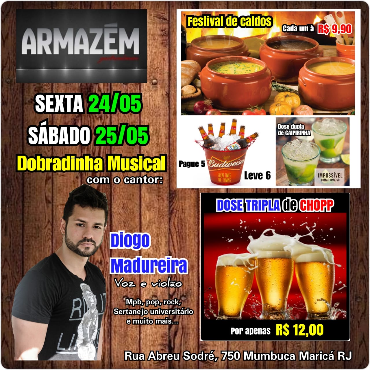 Que tal uma música ao vivo pra agitar sua noite de sexta-feira (24/05) e também no sábado (25/05)? Então, com repertório eclético e repleto de músicas nacionais e internacionais, a saber, MPB, pop, rock, sertanejo universitário? O Facenews indica Diogo Madureira no Armazém Gastronômico. Atenção para o festival de caldos, dose dupla de caipirinha e dose tripla de chopp. Restaurante, com monitora para as crianças, petiscos e os melhores chopps. O Armazém Gastronômico fica na Rua Abreu Sodré, 750 Mumbuca, Maricá(RJ).