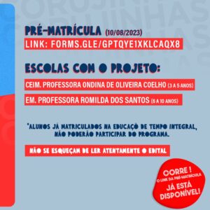 Ao todo, são oferecidas 60 vagas no Centro de Educação Infantil Municipal (CEIM) Professora Ondina de Oliveira, no Flamengo, para crianças de 3 a 5 anos, e outras 60 ofertadas na Escola Municipal Professora Romilda dos Santos, no bairro Pedreiras, para alunos de 6 a 10 anos. Estudantes matriculados na educação de tempo integral não poderão participar do programa. As aulas estão previstas para iniciarem no dia 21/08.