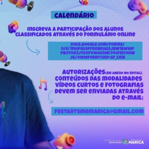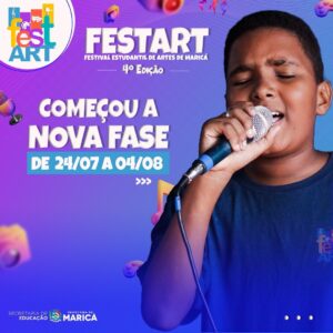 A Prefeitura de Maricá, por meio da Secretaria de Educação, segue até o dia 04/08 com inscrições para a fase distrital do 4º Festival Estudantil de Artes de Maricá (Festart). O procedimento deve ser feito pelo formulário online: https://encurtador.com.br/inqyD com os estudantes classificados em primeiro lugar por modalidade/categoria (faixa etária).
