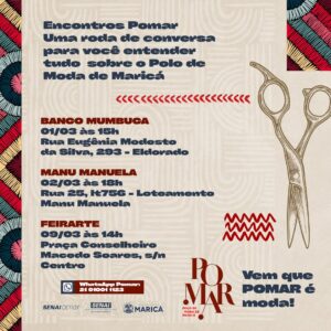 A segunda, terceira e quarta edições do “Encontros Pomar” – apresentação nos bairros para que a população conheça o futuro Polo de Moda de Maricá – serão realizadas no Centro e no Manu Manuela. Nesta quarta-feira (01/03), no auditório do Banco Mumbuca, às 15h. Na quinta-feira (02/03), às 18h, será a vez dos moradores do Manu Manuela participarem da atividade. Já na segunda semana do mês, quinta-feira (09/03), às 14h, a ação acontece na Feirarte, no Centro. A primeira edição do “Encontros Pomar” aconteceu em janeiro no bairro Itaipuaçu, dentro da Feira da Colmeia.