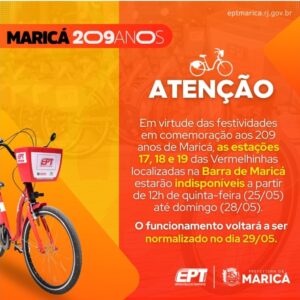 A Prefeitura de Maricá, por meio da Empresa Pública de Transportes (EPT), vai suspender o funcionamento de três estações de bicicletas vermelhinhas a partir de 12h de quinta-feira (25/05) até as 22h de domingo (28/05), localizadas na Barra de Maricá. A suspensão das estações 17 (Barra I), 18 (Barra II) e 19 (Marielle Franco) acontece por causa das festividades pelos 209 anos de Maricá.