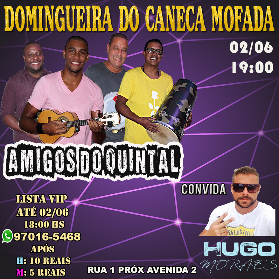 Então, esperando o Arraiá e você quer curtir uma boa roda samba? Pronto, a boa agora é roda de samba com Amigos do Quintal comemorando na Domingueira (o2/06) do Caneca Mofada. Samba, alegria e alto astral é com os Amigos do Quintal, repertório diferenciado que não deixa ninguém parado. O melhor do samba, pagode retrô e MPB, de uma forma que você nunca viu ou ouviu, confira! E no Caneca Mofada, a bebida é gelada de verdade…Além disso, todos trabalham de sorriso aberto …Muito bacana!! O Caneca Mofada fica na Rua Um (próximo à rotatória), Jardim Atlântico, Itaipuaçu. Telefone e Whatsapp 97016-5468. Tem lista VIP até às 18 h do dia 02/06 e depois, preço diferenciado para homens e mulheres.