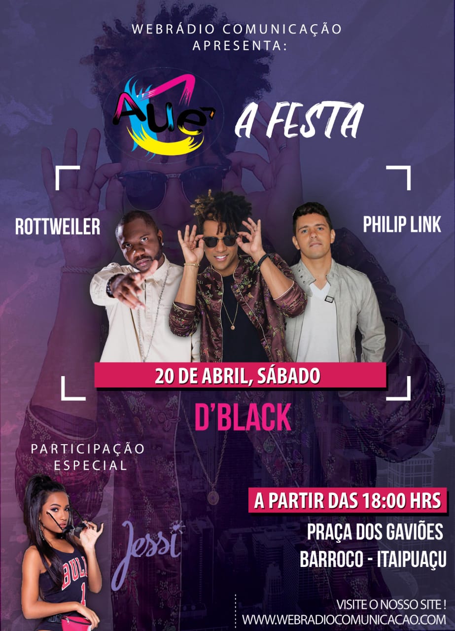 Imperdível, tremenda! Assim será Aue 3 – A Festa com a presença de Vinicius D’Black, Rottweiler, Philip Link, Jon Sandes, Bel Gabriel. Além disso, Maiara Coboski, Muro Mello e a participação especial de Jessi. Aue 3 – A Festa será neste sábado (20), a partir das 18 hs. Quer curtir essa Festa???? A Praça dos Gaviões fica na Avenida Um, esquina com 36, em Itaipuaçu.