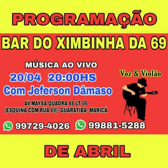 Essa é para quem curte voz e violão. Jeferson Dâmaso se apresenta neste sábado (19) às 20 hs no Bar do Ximbinha da 69. O Bar fica na Av. Maysa qd 88, lt 6 (esquina com Rua 69), em Guaratiba, Maricá. Telefones: 99729-4026 e 99881-5288.