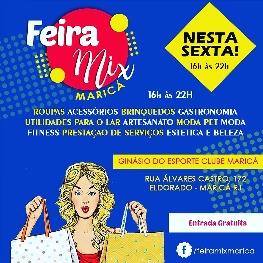 Nesta sexta-feira (19), das 16 às 22 hs, no Ginásio do Esporte Clube de Maricá, tem Feira Mix Maricá. Então, serão diversas barracas com roupas, acessórios, brinquedos, artesanato, moda fitness. E, é claro gastronomia, além de estéticoa e beleza. Entretanto, seu bichinho de estimação não será esquecido, haverá também moda pet. A entrada é gratuita e o Ginásio Esporte Clube Maricá fica na Rua Álvares de Castro, 172, Eldorado, Maricá.