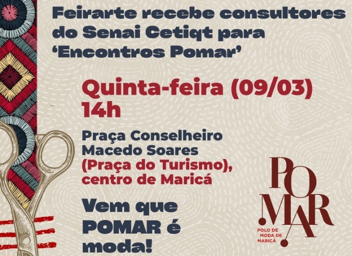 Após realizar palestras na Feira da Colmeia, em Itaipuaçu; Banco Mumbuca, no Centro e associação de moradores do bairro Manu Manuela, chegou a vez dos profissionais que atuam na Feirarte, participem do “Encontros Pomar”, apresentação para que a população conheça o futuro Polo de Moda de Maricá. A ação acontece nesta quinta-feira (09/03), às 14h, na Praça Conselheiro Macedo Soares (Praça do Turismo), no Centro.