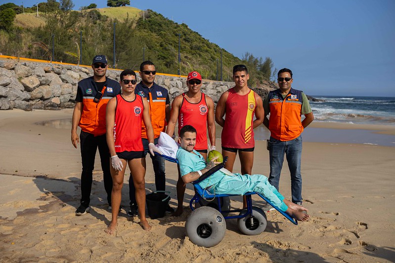 Além disso, foi utilizada uma cadeira anfíbia, equipamento adaptado para facilitar a locomoção na areia e permitir que ele chegasse à beira do mar.