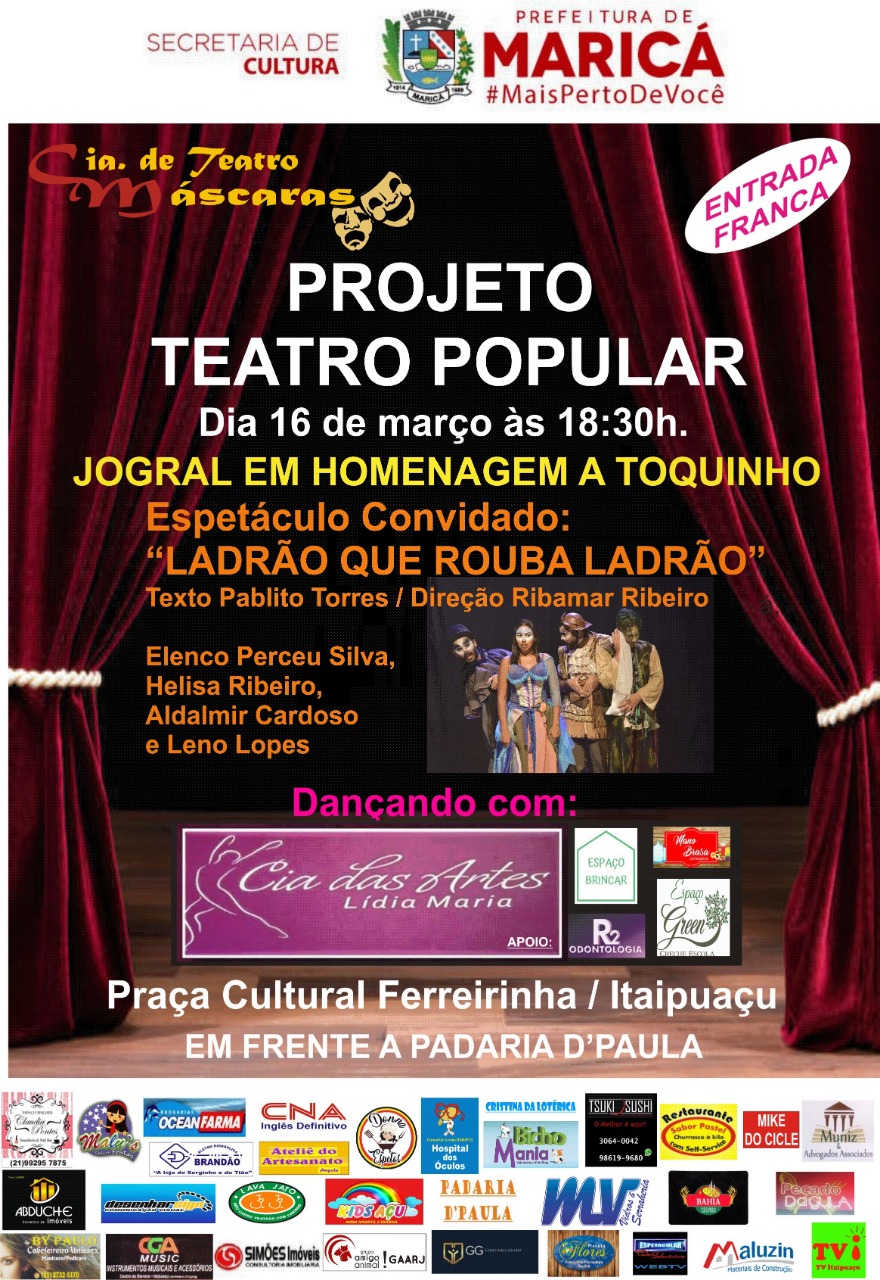 Antes de mais nada, você já levou seu filho ao teatro? Ir ao teatro é cultura, antes de ser entretenimento ou simples passeio. É um momento de compartilhamento de emoções que são despertas naqueles momentos. Agora imagine ir ao teatro numa praça!!! Dessa forma, o Projeto Teatro Popular apresenta a peça “Ladrão que rouba ladrão” , neste sábado (16) às 18:30 h na Praça do Ferreirinha, Itaipuaçu. Venha gargalhar com a atuação dos atores Perceu Silva, Heliza Ribeiro, Adalmir Cardoso e Leno Lopes.