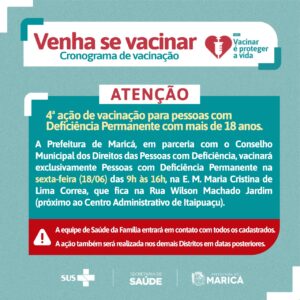 Para os próximos dias até 3 de julho, além dos grupos prioritários que já vem sendo imunizados, os motoristas de ônibus também passarão a ser contemplados, embora a data exata ainda não tenha sido anunciada. Está prevista ainda para esta sexta-feira (18/06) uma vacinação específica para pessoas com deficiência permanente na Escola Municipal Maria Cristina de Lima Correa, em Itaipuaçu. A Secretaria de Saúde lembra também que os idosos e profissionais de saúde que ainda não tomaram a segunda dose da CoronaVac devem procurar o Posto de Saúde Central sempre às segundas-feiras, das 9h às 12h, para completar a imunização.