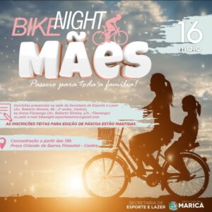 A Prefeitura de Maricá, por meio da Secretaria de Esporte e Lazer, realiza no dia 16 de maio, na Praça Orlando de Barros Pimentel, no Centro, a partir das 18h, a primeira edição do Bike Night de 2023. O passeio ciclístico, que incentiva a prática de atividades físicas na cidade, fará uma homenagem especial ao Dia das Mães. Vale destacar que as inscrições feitas para edição de Páscoa estão mantidas.