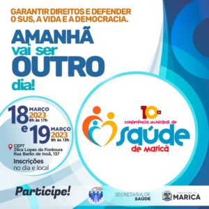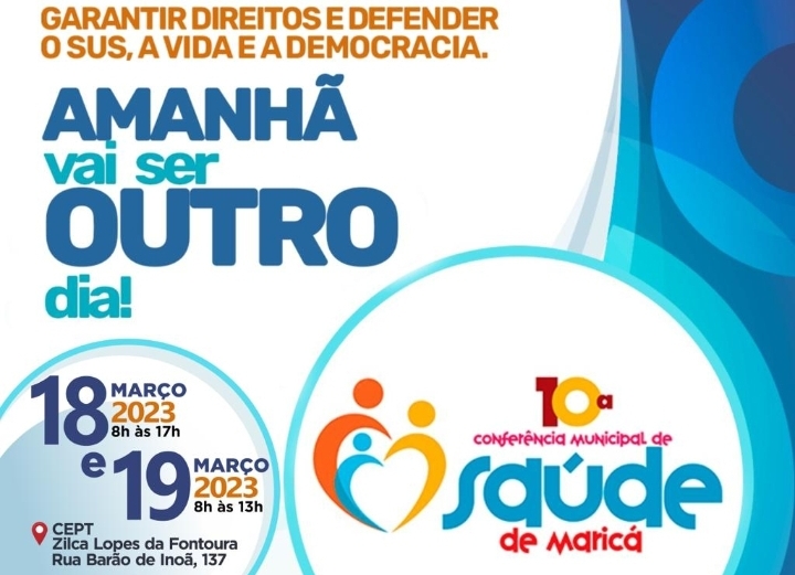 A Secretaria de Saúde de Maricá e o Conselho Municipal de Saúde (CMS) realizam nos dias 18 e 19/03, a partir das 8h, a 10ª Conferência Municipal de Saúde, encontro que irá debater propostas para fortalecer e otimizar os serviços do Sistema Único de Saúde (SUS) na cidade. Neste ano, a conferência acontece no CEPT Zilca Lopes da Fontoura, no Centro, com programação dedicada ao tema “Defender o SUS, a vida e a democracia: amanhã vai ser outro dia”. A atividade é aberta ao público e as inscrições devem ser feitas no primeiro dia do evento diretamente no local.