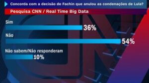 Os entrevistados foram questionados se concordam com a decisão do ministro em anular as condenações do ex-presidente Lula. Os resultados mostram que 36% do público concorda com a decisão de Fachin, enquanto 54% não concordam. 10% não sabem ou não responderam.