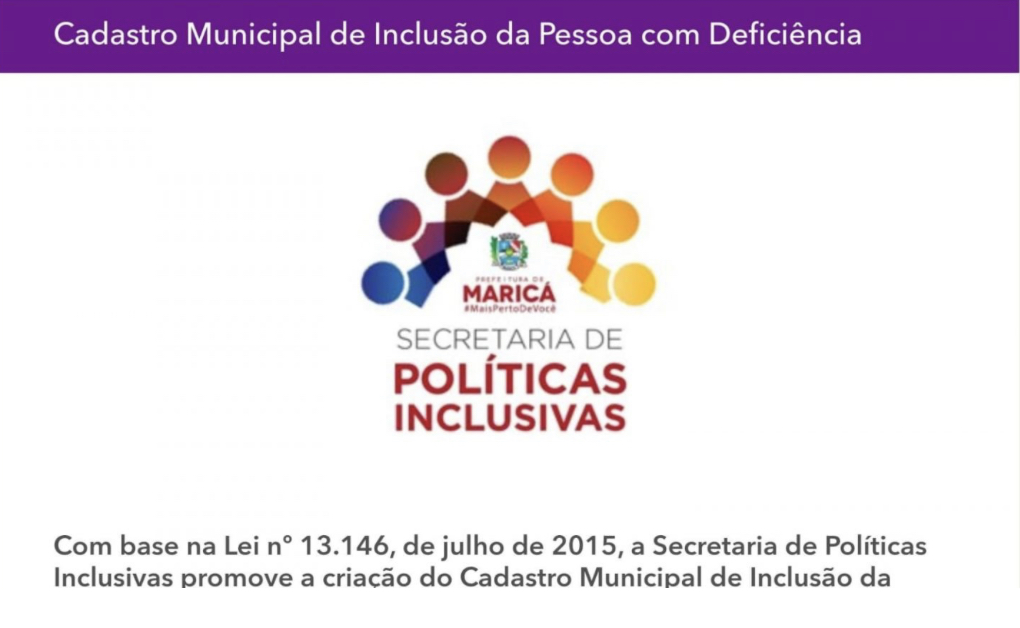 A Prefeitura de Maricá, por meio da Secretaria de Políticas Inclusivas, dispõe o Cadastro Municipal de Inclusão da Pessoa com Deficiência para inserção de dados. O registro foi criado para promover a visibilidade das pessoas com deficiência e construção de políticas públicas para a PcD, além de formular, gerir, monitorar e avaliar as políticas públicas voltadas para o segmento. Os cadastros podem ser realizados pelo link https://encurtador.com.br/cgikl.