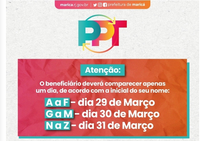A Prefeitura de Maricá realiza, nos próximos dias 29, 30 e 31 de março, evento de lançamento do Programa de Proteção ao Trabalhador (PPT) e convoca os 11.074 inscritos. O evento acontece no Centro de Educação Pública Transformadora (CEPT) Zilca Lopes da Fontoura (Rua Barão de Inoã, n° 137), no Centro, a partir das 19h. Na ocasião, será entregue a cartilha com todas as informações e orientações referentes ao PPT. Os beneficiários serão divididos por ordem alfabética, para melhor organização, devendo comparecer aqueles que receberam e-mail e/ou mensagem de whatsapp de confirmação, nos dias referentes à letra inicial do nome: letras A a F no dia 29; G a M, dia 30 e N a Z, dia 31.