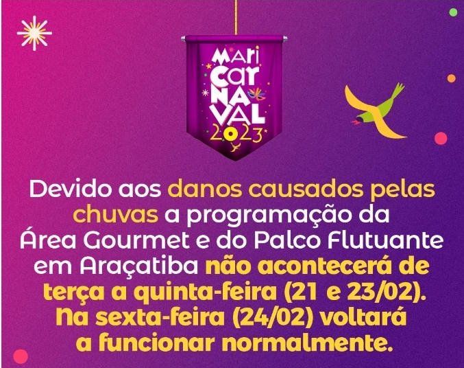 A Prefeitura de Maricá, por meio da Secretaria de Promoção e Projetos Especiais, informa que devido aos danos causados pelas últimas chuvas, a programação do palco flutuante e o funcionamento da área gourmet do circuito Sol & Samba, em Araçatiba, foram suspensos de terça a quinta-feira (21 e 23/02). Na sexta-feira (24/02) voltará a funcionar normalmente, a partir das 16h. O espaço gourmet Sol & Samba ficará montado na Orla de Araçatiba até 30 de abril com opções diversas para saborear tanto as delícias gastronômicas quanto as opções cervejeiras de Maricá.