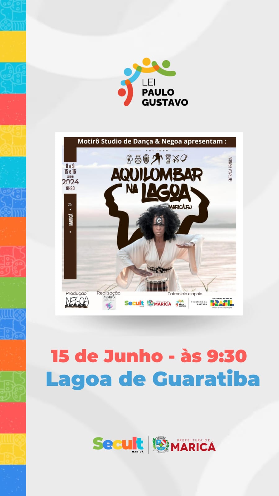Com apoio da Secretaria de Cultura de Maricá, o projeto “Aquilombar na Lagoa” acontece neste fim de semana (15 e 16/06), às 9h30, na Lagoa de Guaratiba. No local haverá muita música, dança e roda de conversa sobre cultura afro. O evento é gratuito e tem classificação livre.