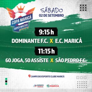 Neste sábado (02/09) entram em campo os times Dominante F.C. X E.C. Maricá, às 9h15, e o time 60 Joga, 50 assiste X São Pedro F.C entrará em campo às 11h15.