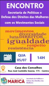 A Prefeitura de Maricá, por meio da Secretaria de Políticas e Defesa dos Direitos das Mulheres, realiza nesta quarta-feira (05/06) um encontro para apresentar propostas que nortearão a agenda de ações, no enfrentamento à violência contra a mulher. O debate acontecerá a partir das 14h, na Casa dos Conselho, localizada na Rua José Custódio Soares, no Centro.