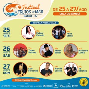 “A terceira edição do Festival de Frutos do Mar vai acontecer na recém-inaugurada Orla de Bambuí e será mais uma ação desenvolvida pelo Plano Maricá 2030, que tem por objetivo ampliar o fluxo de turistas para todas as partes da cidade. Por meio do projeto circuito de pesca esportiva amadora, temos obtido ótimos números de ocupação e divulgação da cidade. Com o festival, esperamos fortalecer a vocação de Maricá pelo consumo de frutos do mar e levar entretenimento de qualidade ao cidadão e aos nossos visitantes”, afirma o secretário de Promoção e Projetos Especiais de Maricá, José Alexandre Almeida.